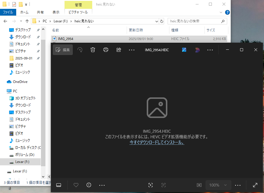 iphoneのカメラ設定が初期値でWindowsパソコンにあってない形式で保存しているためです。