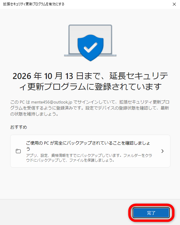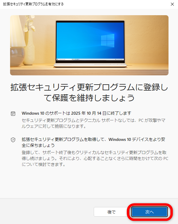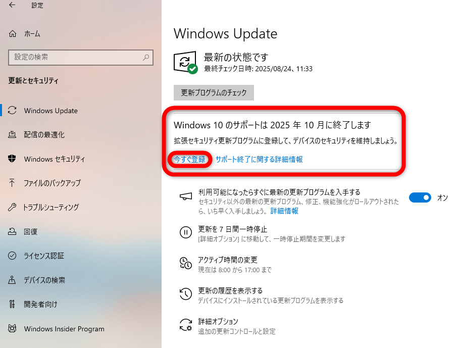 スタート→設定→更新とセキュリティ→WindowsUpdate→”Windows10のサポートは2025年10月に終了します”の下の今すぐ登録(←ここの文字は出るタイミングが異なる方がいます)