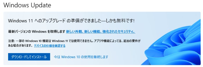 スタート→設定→更新とセキュリティ→WindowsUpdate→Windows11のアップグレードの準備が出来ました。ダウンロードしてインストール